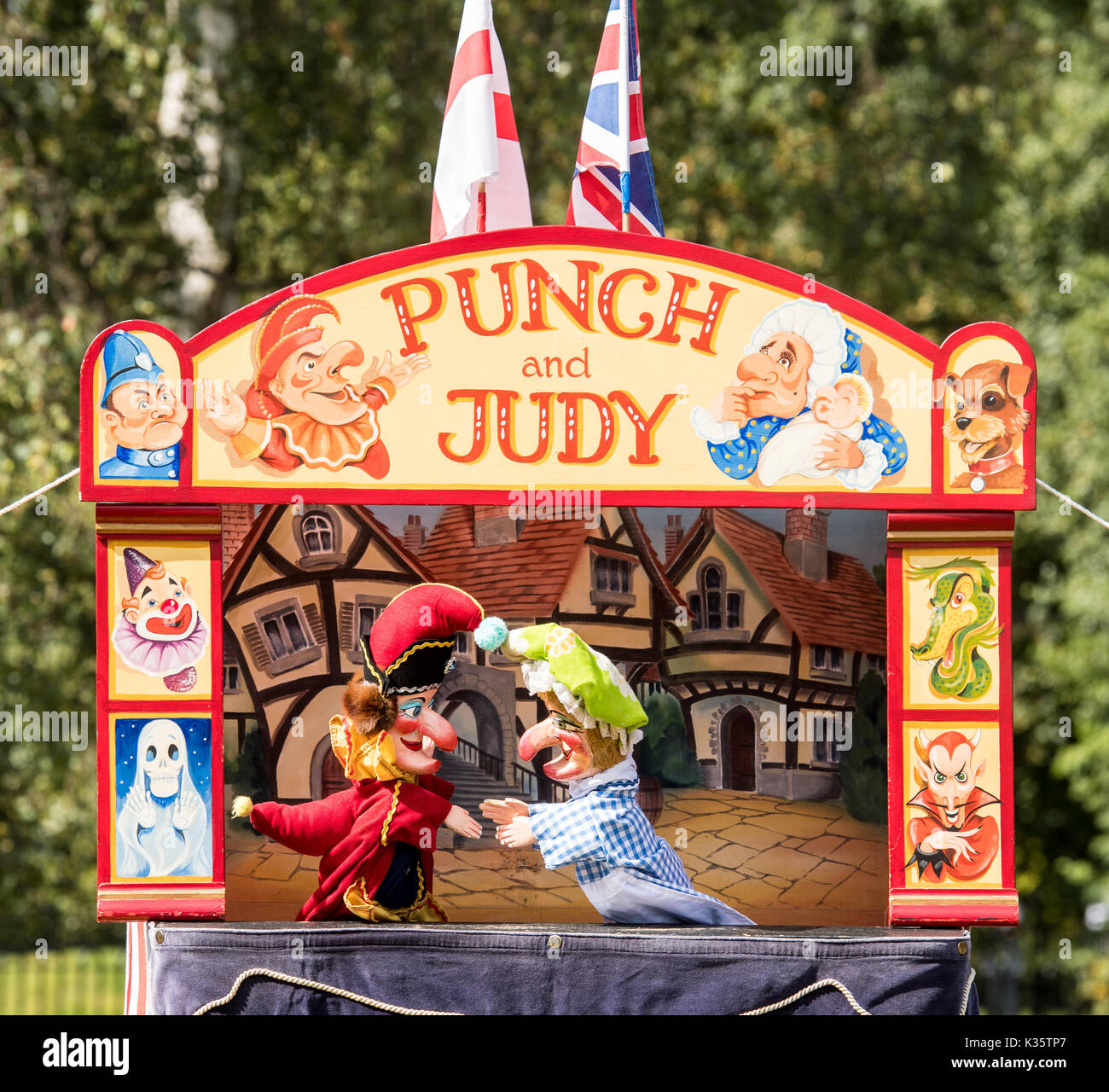 Mr punch with Judy holding the baby in front of a Punch and Judy glove